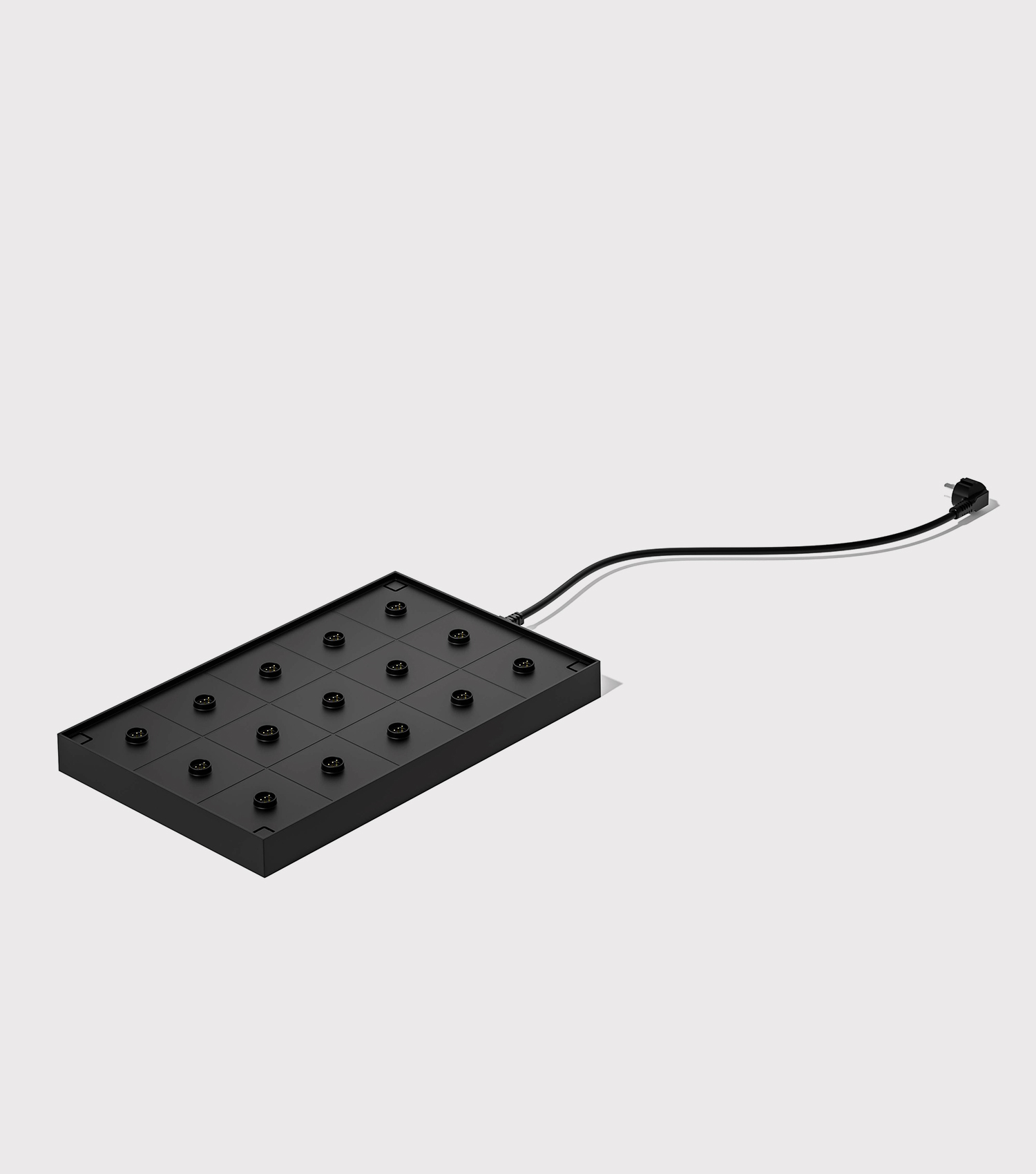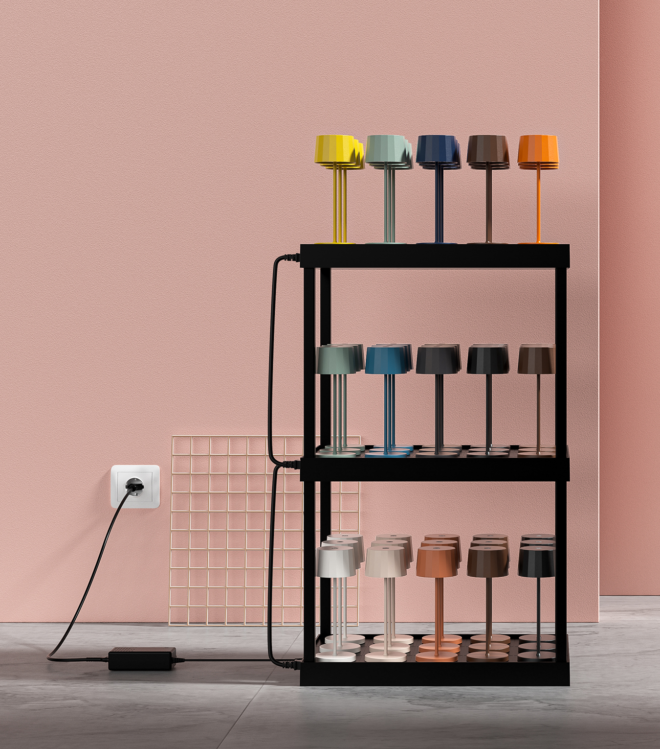 Micro multi contact charging shelf. Stackable up to 3 levels. One charger shelf charges15 table lamps together.