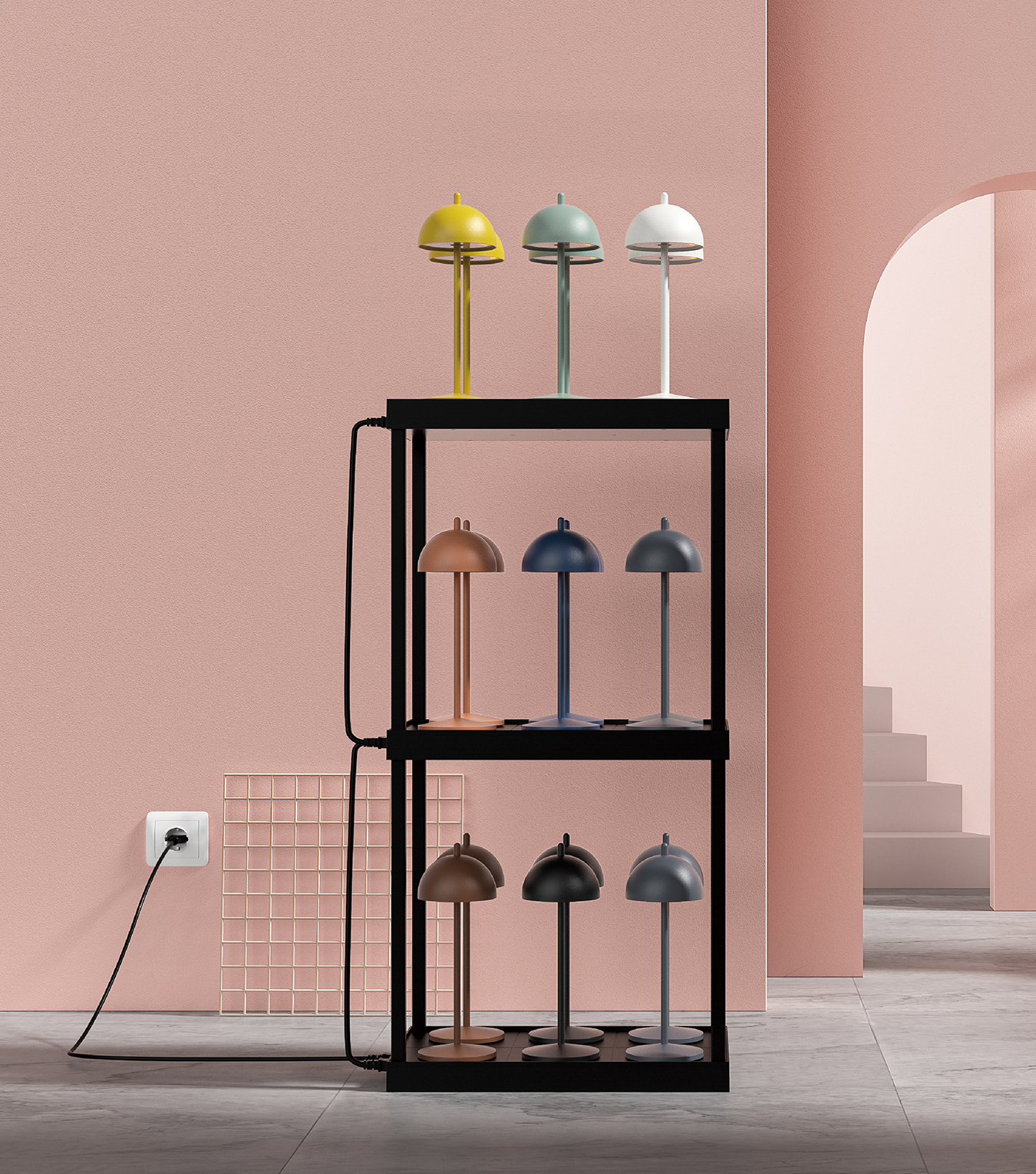 Recharging and storage multi-contact charging shelf. Stackable up to 3 levels. One charger shelf charges 6 table lamps together.